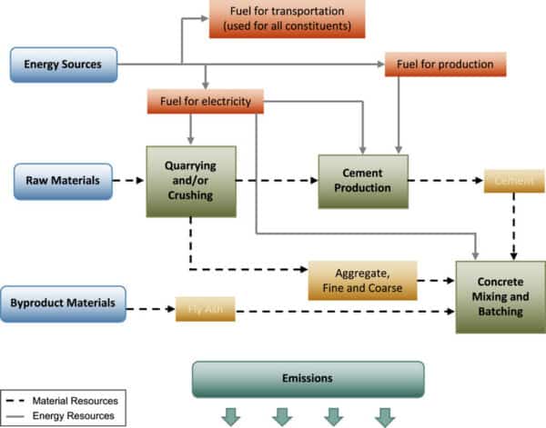 Concrete is a mixture of cement, sand, gravel, and water. The sand and gravel themselves don’t emit any carbon, but they do require huge machines to mine the material and transfer it to a concrete plant. Those large excavators and other machines burn copious amounts of diesel fuel.